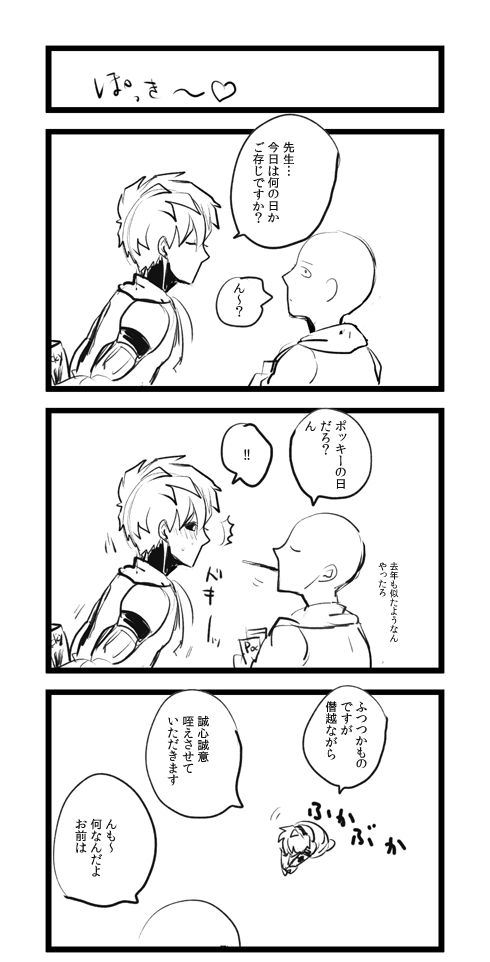 単体 2014/12/01 しわす 師も走る忙しさ師走ですね。久々にモンスターエナジーを買いました。今すごく眠いので今お布団に入ったらすごく幸せな気持ちになる気がする…因みに新刊の話なのですがこのままいけば高校生サイタマくんとお手伝いロボジェノスくんの生活するはなしみたいなパラレルになりそうです。自分でも相変わらず意味不明なのですが怖いのは今までで一番需要がなさそうな話だということかな…まぁ…好きなことを描いているのは今までと変わりないのでとにかく出せるようにがんばりたいです。もうすぐコミクスも発売でウキ!ウキ!モンキーです。