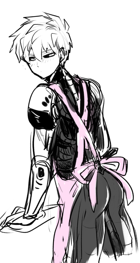 単体 2014/10/03 えぷろんしり となじゃんまさかの週更新でしかもジェノスちゃんの出番まだ終わってなくてハッピー!本体のちっこいやつかわいいので戯れてほしいです。そして先生とキングは見ていてとても癒されます。先生のアンニュイな顔かっこいいのに見れなくて残念ねジェノスちゃん…相変わらずフラグ発言ばっかりのジェノスちゃん…つづきより裸エプロンなジェノスくんです OSHIRI前にも似たようなことを言ったと思うんですけどジェノスは体がごちゃごちゃしてるのでキワドイ格好を描こうと思うと画力のないわたしはいつもウンウン唸りながら描くはめになります。なので皆がもっとキワドイ格好を描いてくれる世界に…なりますように…最近はBL界隈でもガチエロ同人みたいな話を描く人が増えてきて、とてもありがたいかぎりです。大好きです。