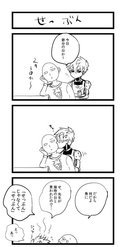 漫画 2015/02/03 せっぶん はずかしC~~~!すごくどうでもいい個人的な解釈なんですが、ジェノスは敬語がヘタだと思っています。いや、頭はいいはずなのでちゃんと言葉は知っていると思うのですが、普段とにかく殆ど敬語を使わなかったのでそんな咄嗟に出てくる感じではないんじゃないかな~という妄想です。なのでなるべく尊敬語というかそういうものを使わないようにしています…そのほうが一生懸命感があってかわいいかなと思って…完全に自己満足の世界なんですが、こういうことをトツトツと、ずーっと考えていくのは楽しいですね。